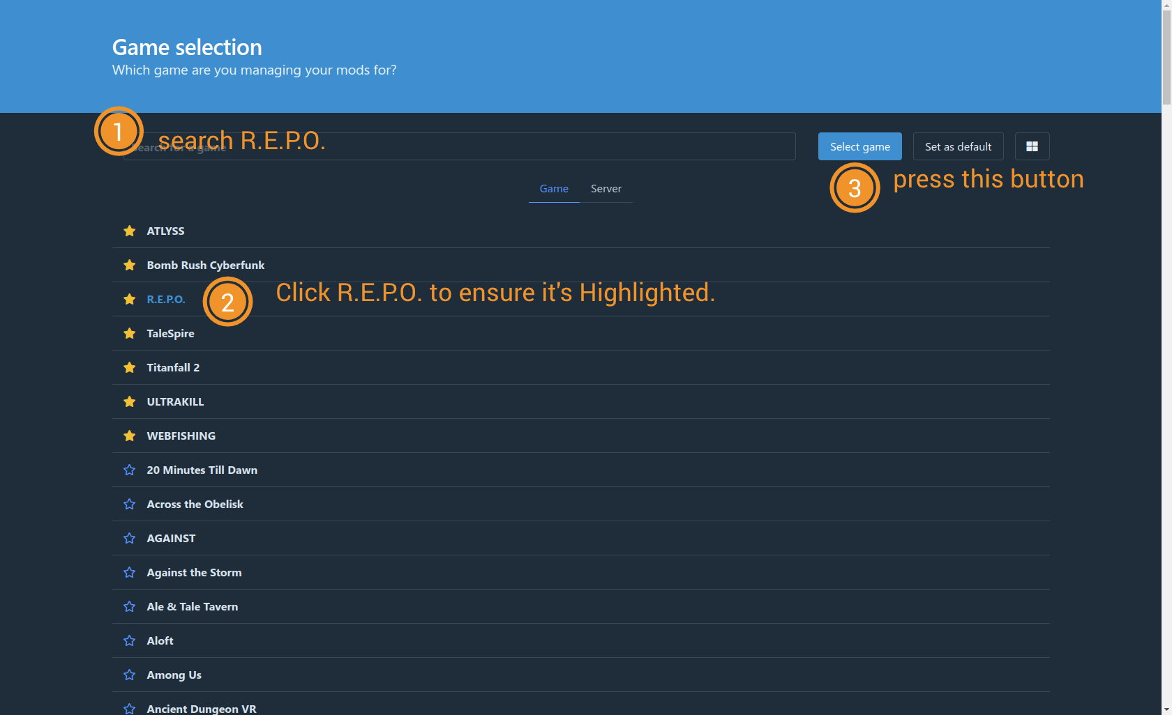 By default r2modman will not have any game selected, or favorited. You can search for R.E.P.O. in the list.